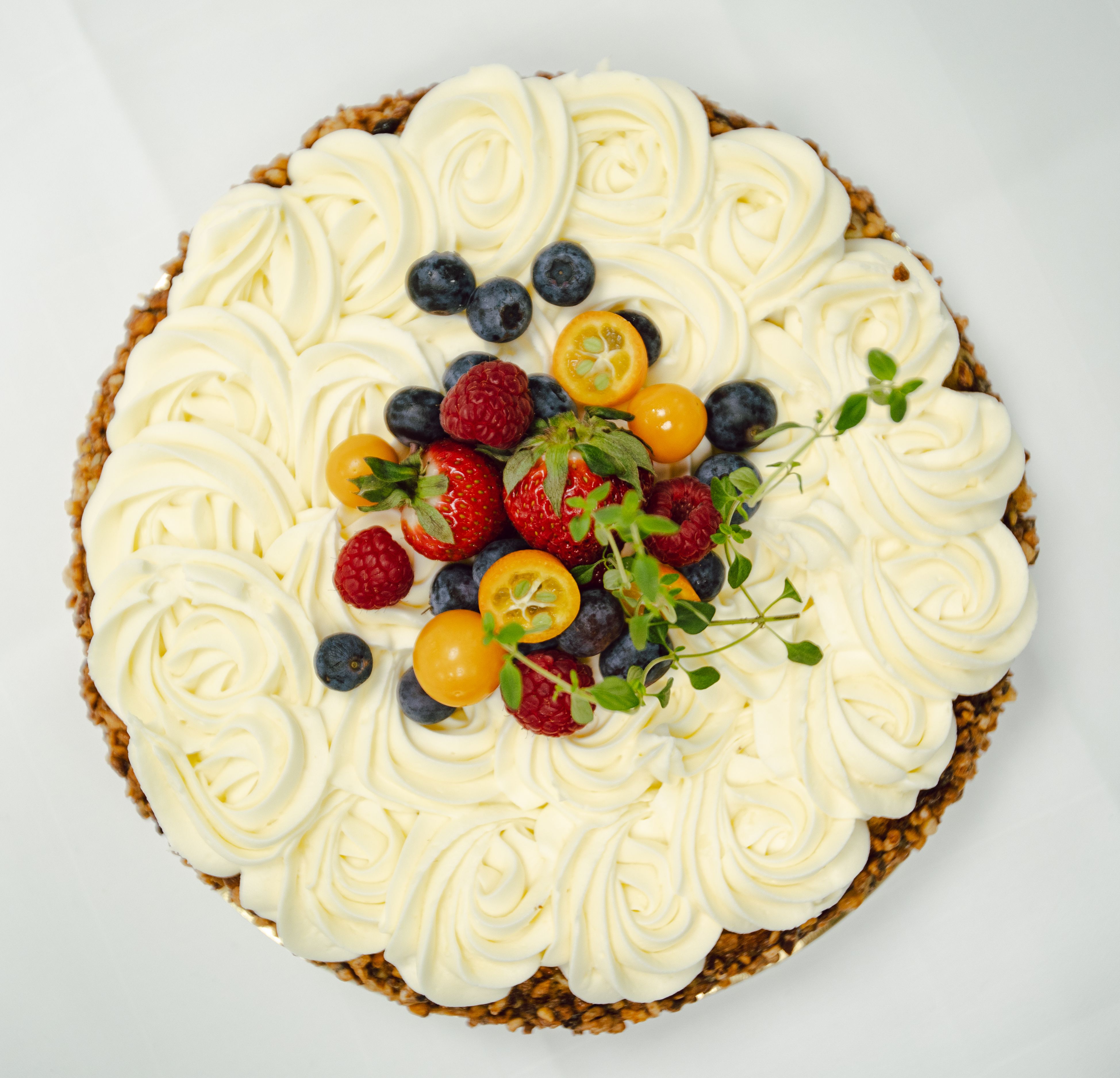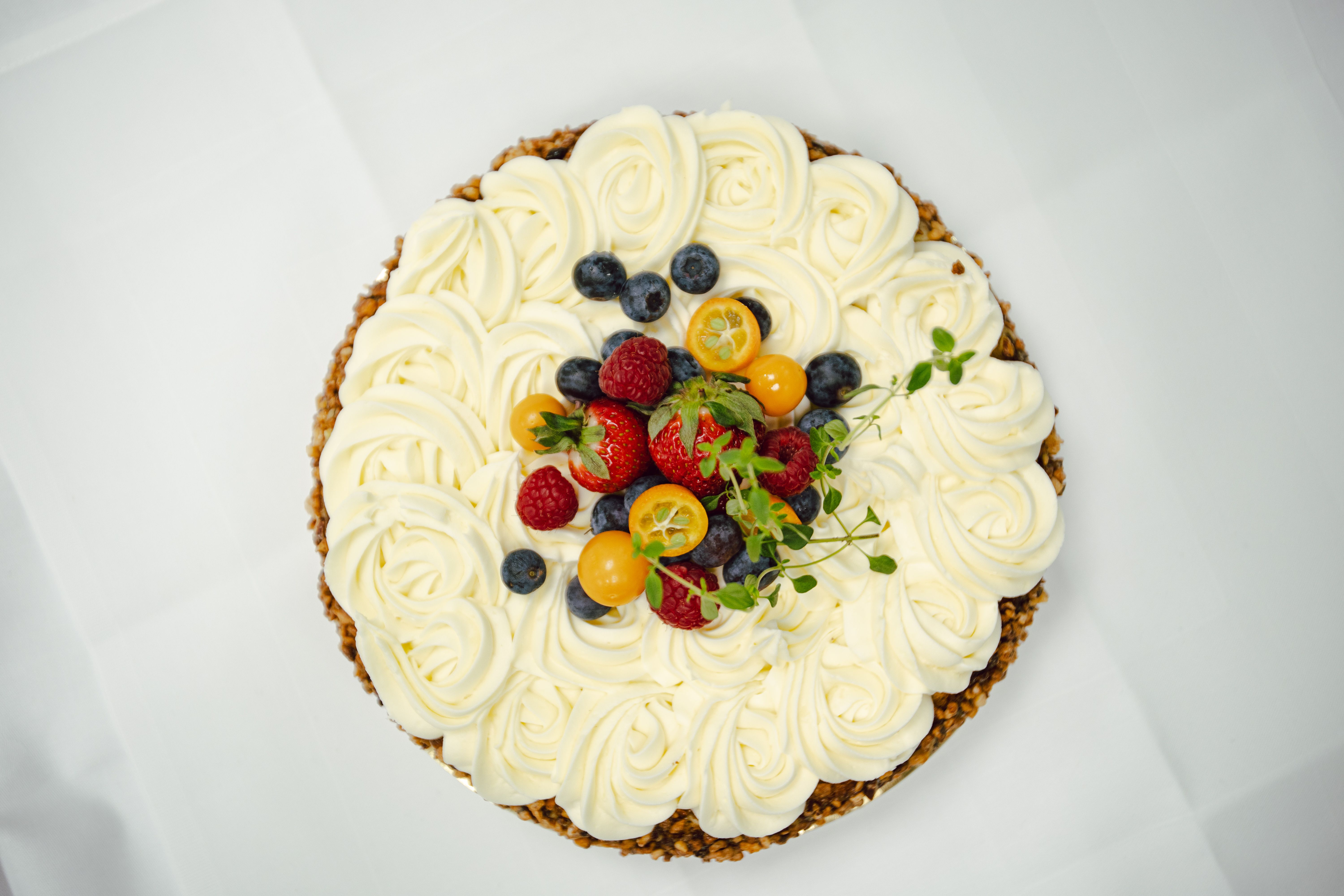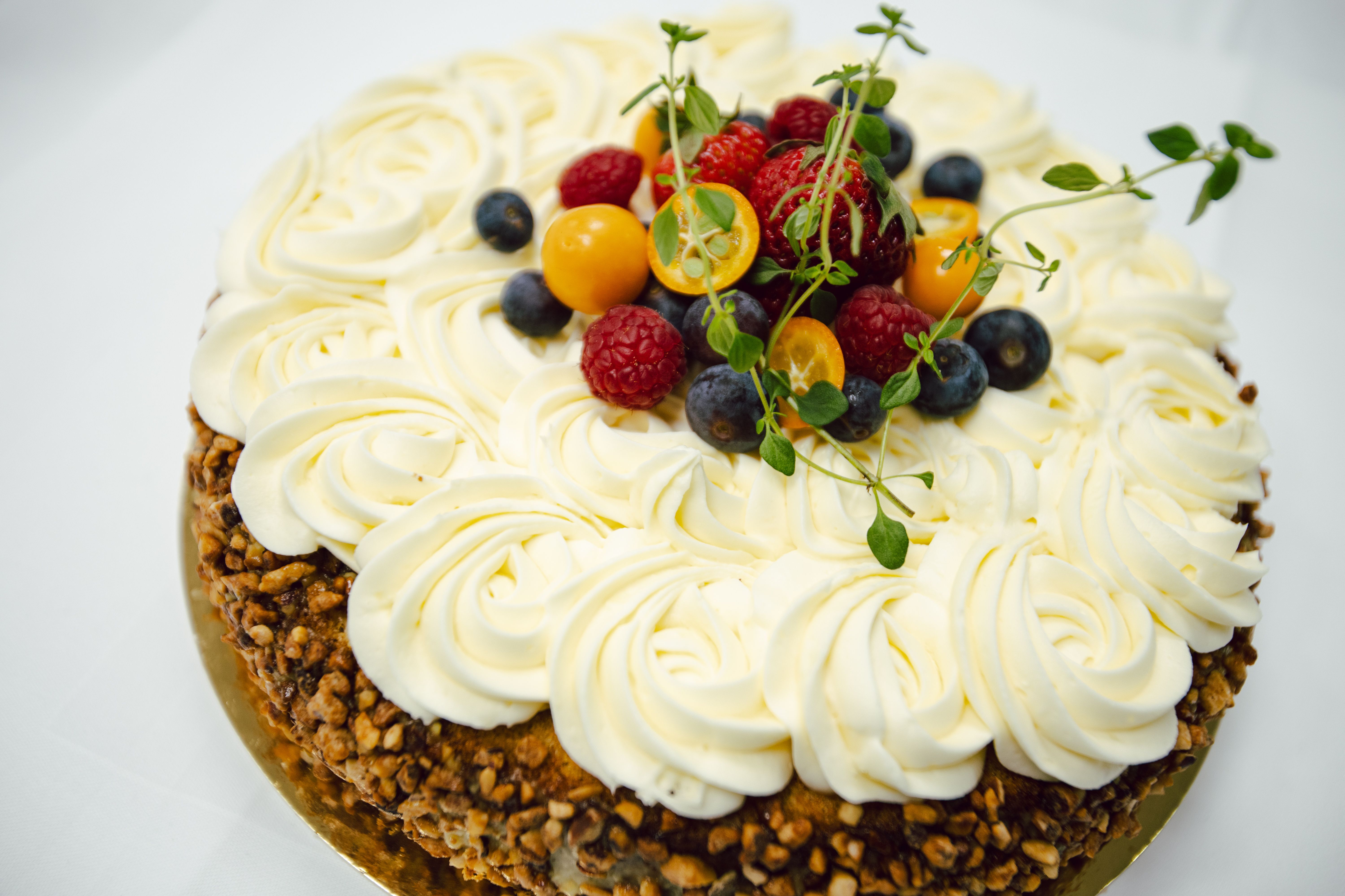 Elegant festkake med makronbunn og fløyelsmyk krem.