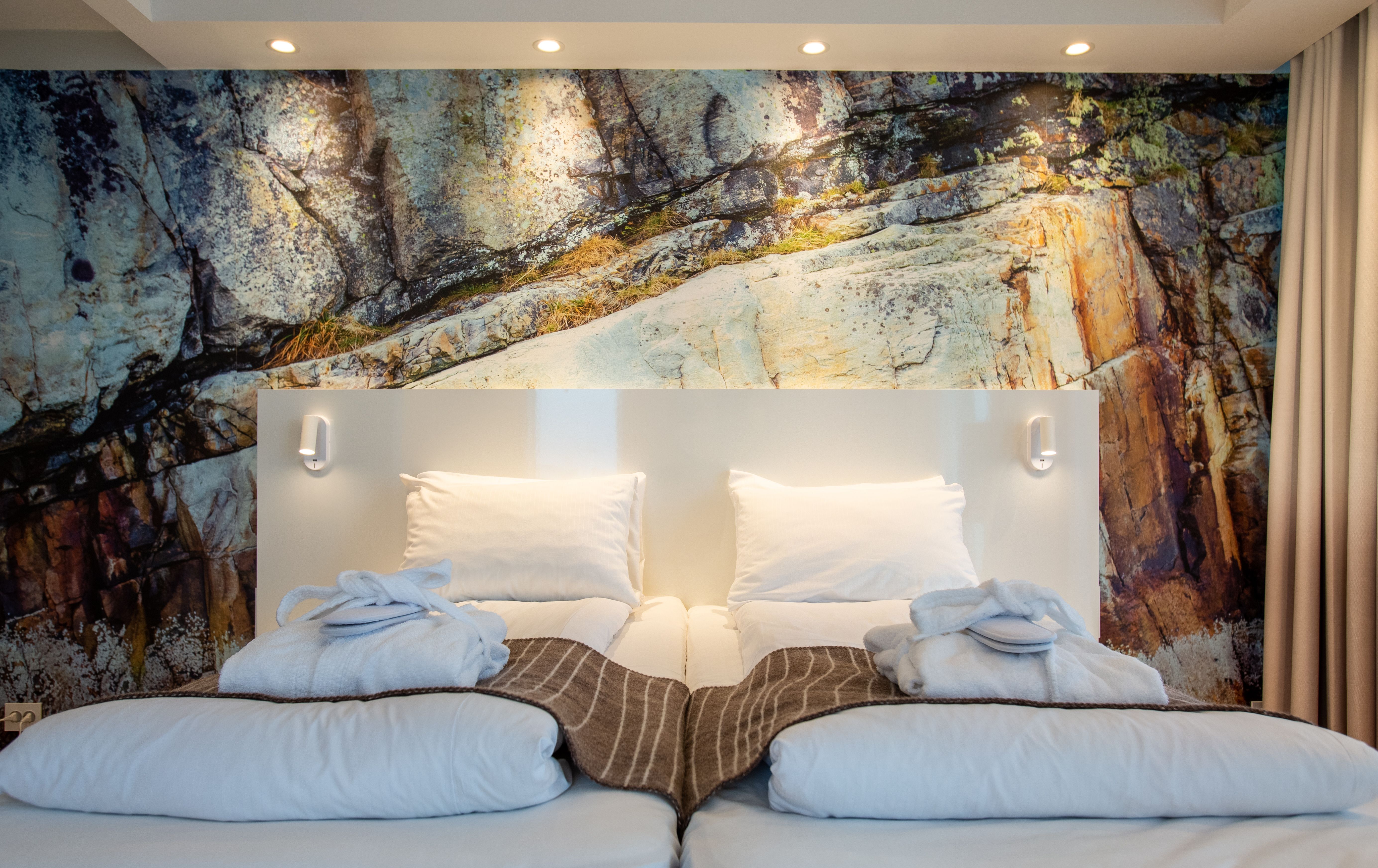 Bildet er av et av våre hotellrom i Panorama View. Rommene er innredet med inspriasjon fra naturen rundt oss og med varige møbel og tekstilvalg.