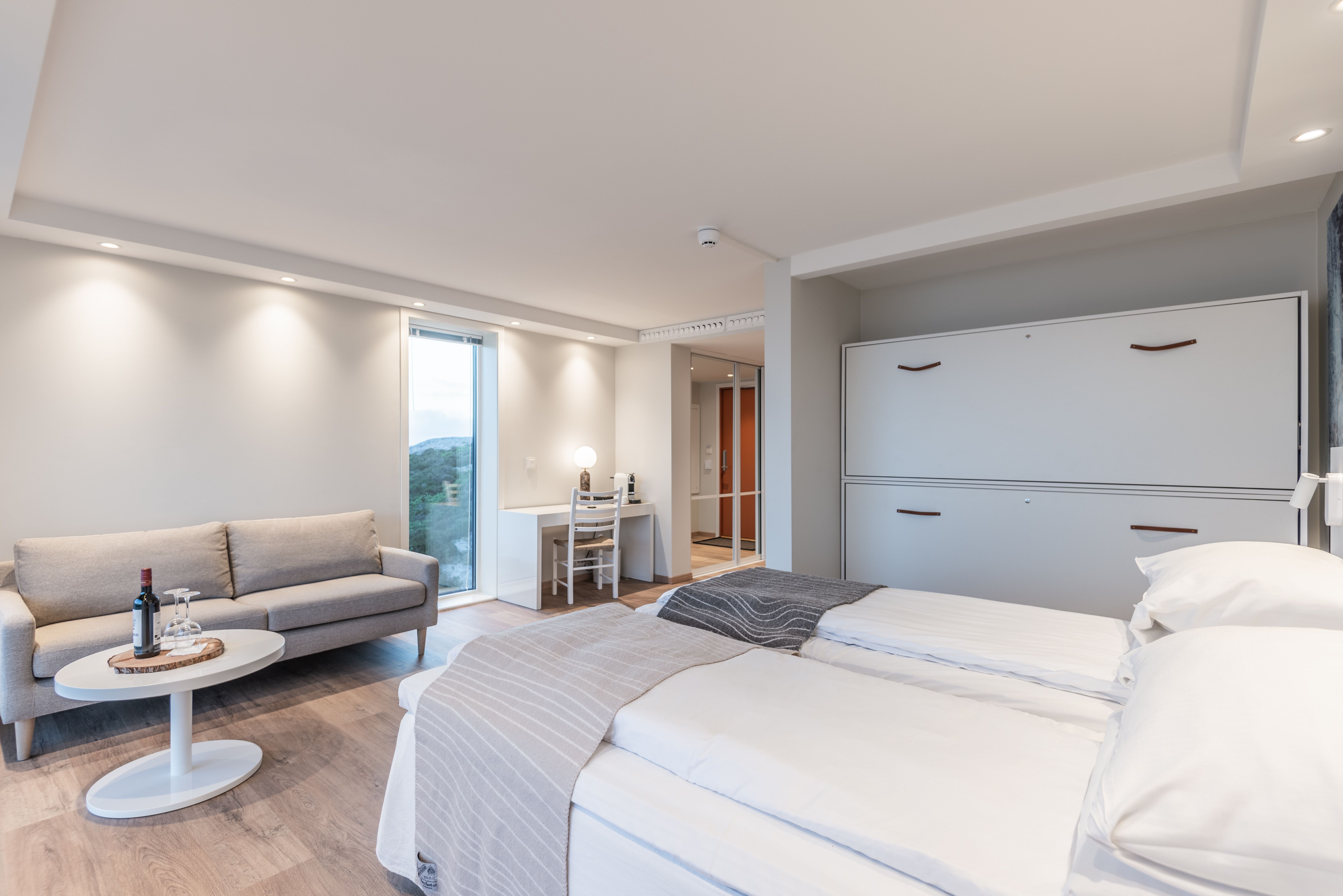 Den perfekte pakken når du skal tilbringe kvalitetstid med vennegjengen eller familien. Dere får vårt største rom med egen terrasse, fantastisk sjøutsikt, sofagruppe på rommet og mulighet for ekstrasenger.